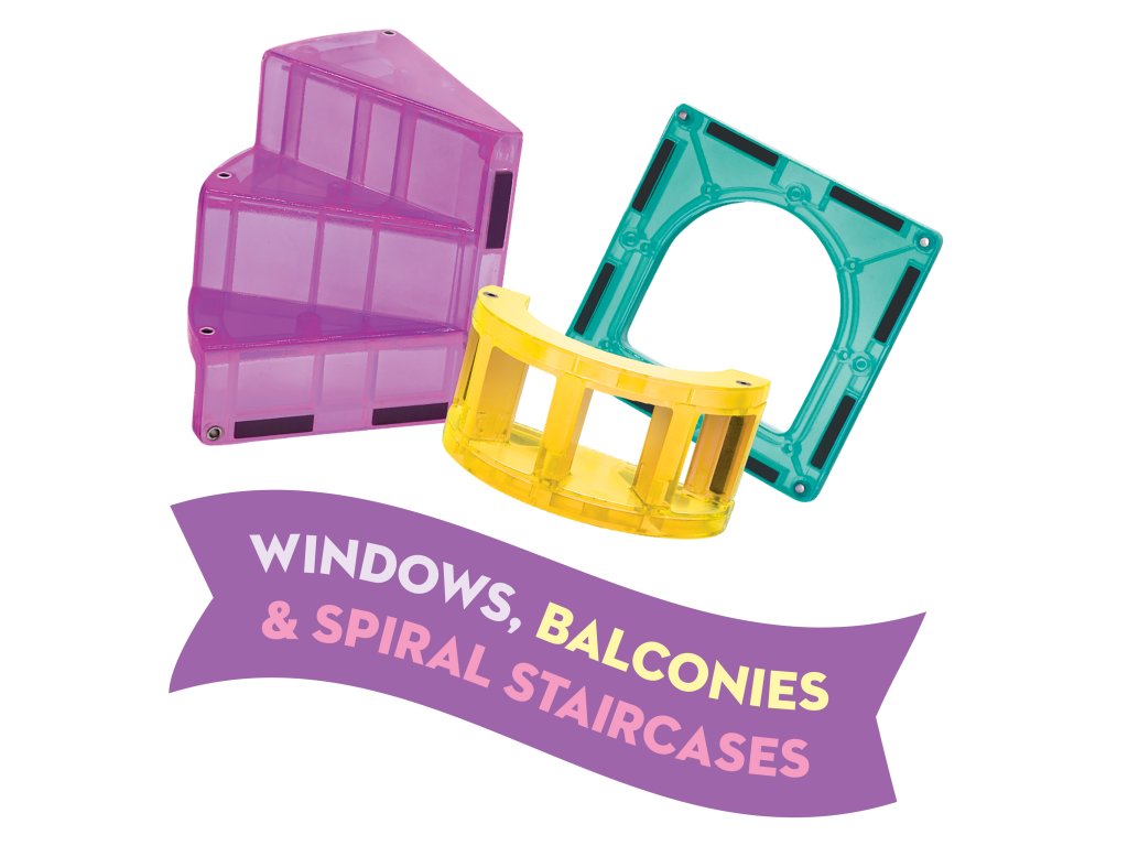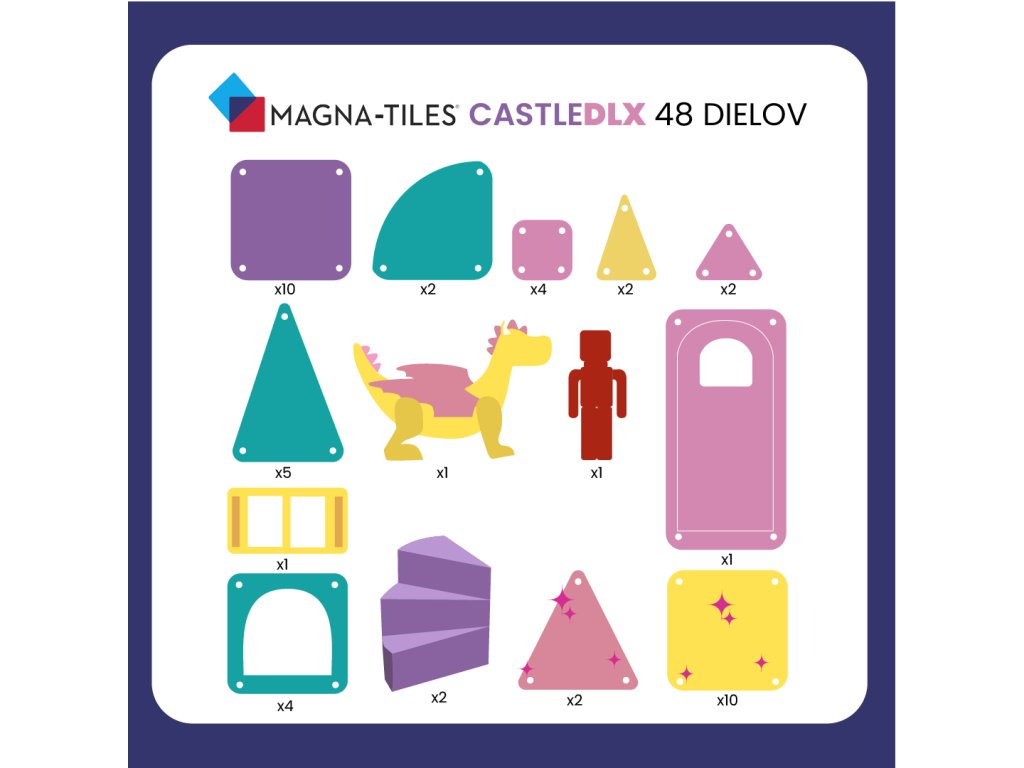 Sada obsahuje 48 magnetických dielikov:1x padací most,1x figúrka draka,1x figúrka šľachtica,2x točité schodiská,2x balkón,4x okno,2x rovnostranný trojuholník (glitre),2x štvrťkruh,5x rovnoramenný trojuholník,20x štvorec (10 trblietok, 10 štandardných),2x rovnostranný trojuholník microMAGS,4x štvorec microMAGS,2x rovnoramenný trojuholníky microMAGS