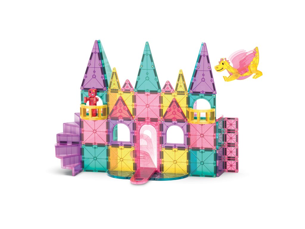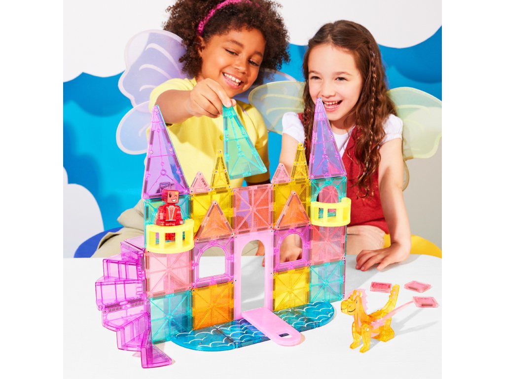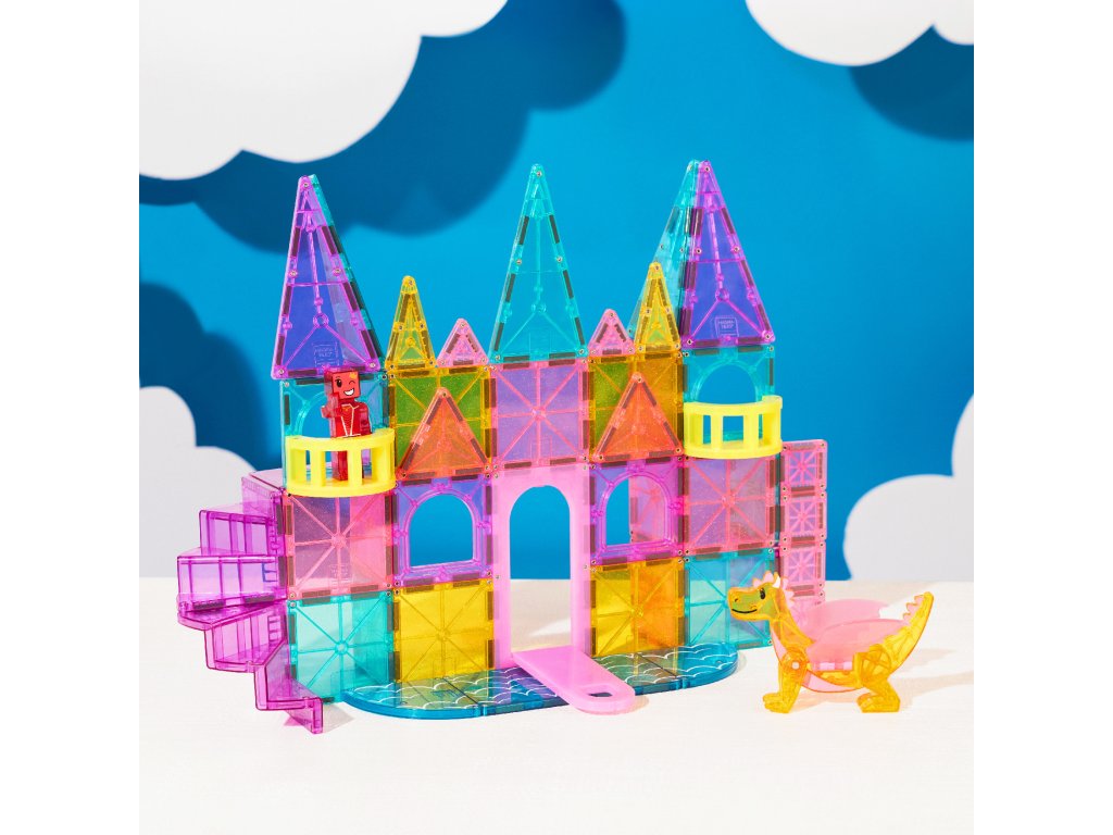 MAGNA-TILES Castle DLX, magnetická stavebnica, prenesie deti do sveta tvorivosti a fantázie. Otvorte funkčný padací most a vstúpte do sveta rozprávkového kráľovstva alebo sa vznášajte po oblohe s kúzelnou figúrkou draka.
