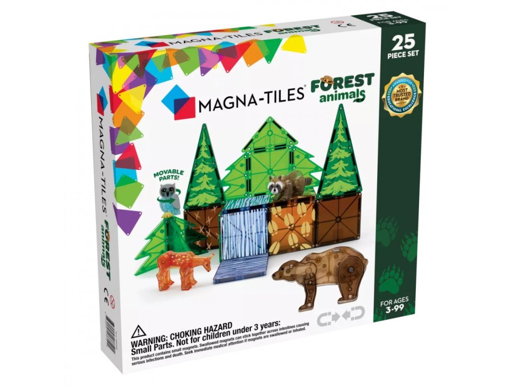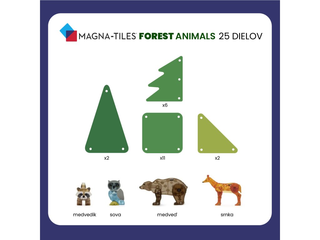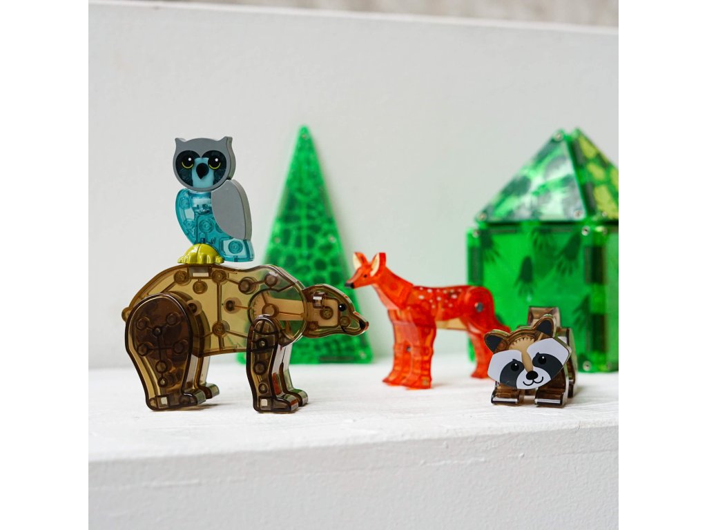 Preskúmajte záhadnú lesnú divočinu s lesnými zvieratkami, ktoré sa spolu zabávajú medzi vysokými stromami. Spriatelíte sa s medvedíkom čistotným, sovou, medveďom aj jeleňom. Táto sada obsahuje vôbec prvé magnetické listy a stromy a všetky dieliky majú nádherné realistické detaily. Jedinečné figúrky zvieratiek podporujú nápaditú hru a rozvíjajú detskú kreativitu. Stavebnica je plne kompatibilná so všetkými Magna-Tiles® sadami, čo zabezpečuje ešte viac tvorivej zábavy.